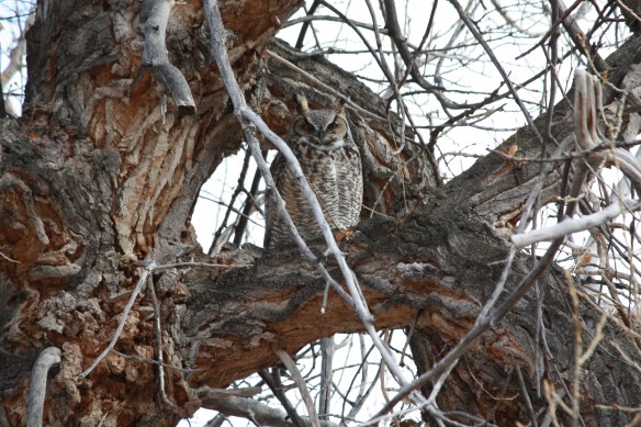 The owls appear to have settled in for the season in the cottonwoods along the creek bottom. Our first sighting was early in January, and they have made their daily presence known since then. The walk today was accompanied by an owlish serenade, which was unusual for midday. We normally hear them singing before dawn and at dusk. And lo, both owls were sighted peering down on Rosie and me as we walked the trail.