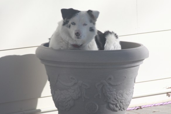 Rosie crawled up into the flower pot on the porch recently to catch some rays and take a break.  She doesn’t like to be photographed, but she didn’t seem to notice the camera pointed at her through the window.  She is a constant companion and believes it is her job to take care of the people who live here.  She watches the doors and windows to detect any movement inside the house that might mean “we’re going for a walk,” or “they’re coming to feed me,” or “it’s time to do chores.”  She is a border collie- Australian shepherd mix, and is an obsessive/compulsive herder who makes it her job to nip at any person or creature who tries to come between us.