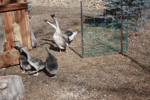Fred, generalissimo of the goose gaggle, is looking downright sorry these days. He has had most of his feathers plucked away and we are still in the grip of winter! Loud honks and squawks from the goose yard led to a recent inspection and it appears the two young males, Ricky and McGill are picking on their father. Poor Fred has a limp from an altercation with a fox (or possibly a bobcat) last autumn that left him nearly crippled, and while he has healed and gets around quite well, he’s not the man he used to be. And he is certainly in no condition to endure continued attacks from Ricky and McGill! What could cause this close-knit little goose family to split apart in savage attacks on each other? And why isn’t Ethel, his partner for life, defending him?